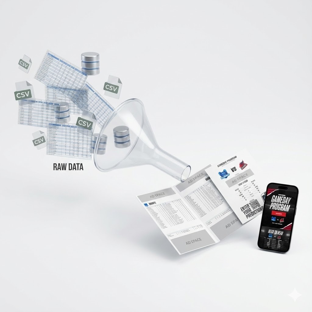 We automatically pull stats, rosters, and standings to build a fresh program for every single game.